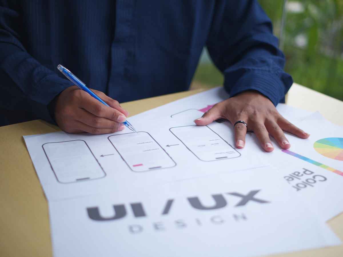 Pessoa desenhando wireframes de aplicativo em uma folha com o texto UI/UX Design, representando planejamento de interface.