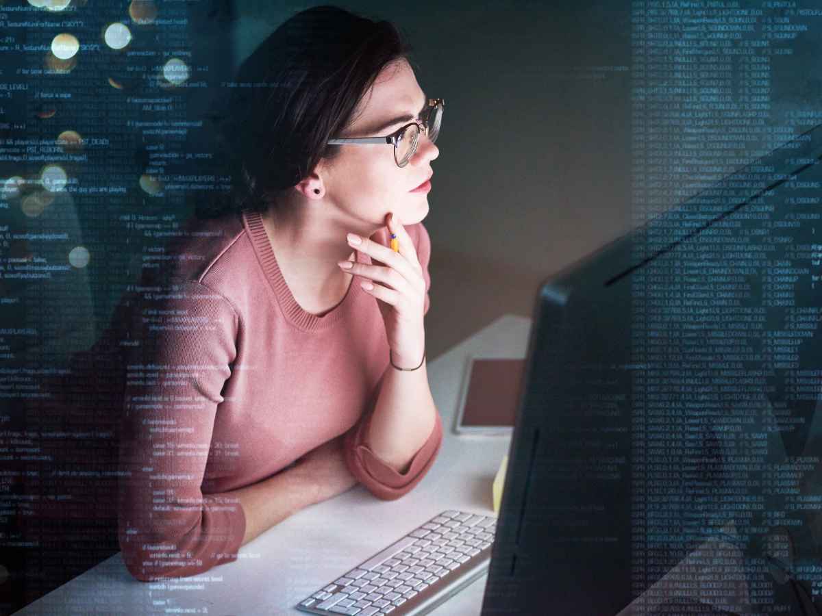 Mulher olhando para a tela do computador com códigos e dados ao fundo