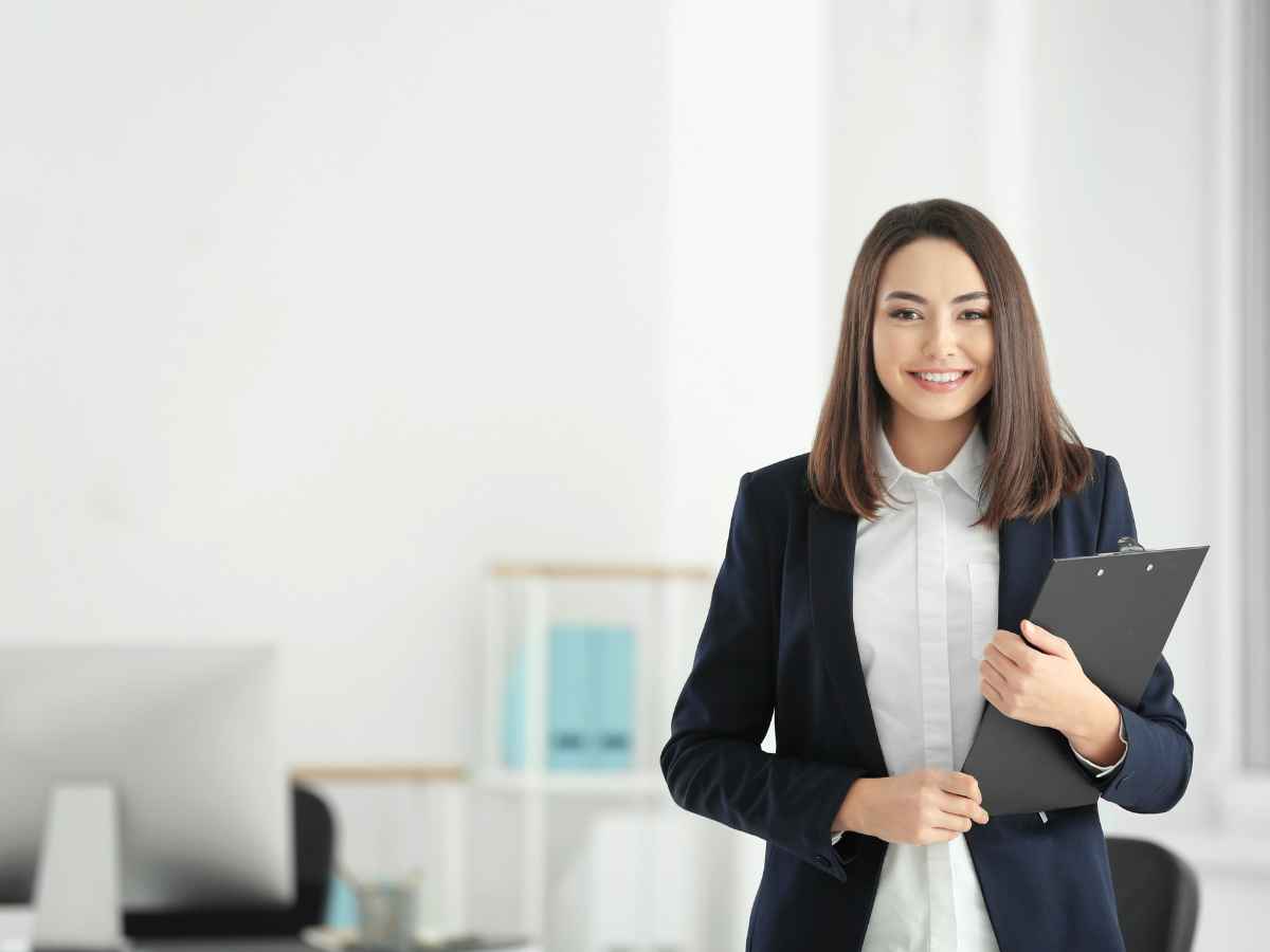 Mulher sorrindo em ambiente corporativo segurando uma prancheta, representando organização e perfil profissional.
